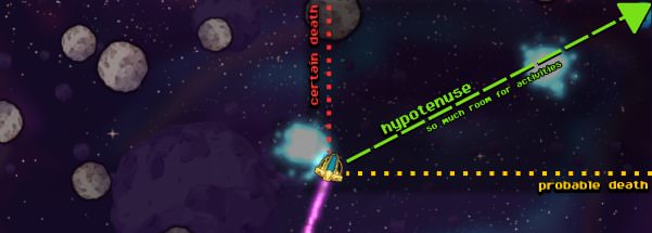 Why? Your ship is always centered on screen and flying at full-speed, which means the corners of the screen are the furthest away from your ship (thanks, Hypotenuse!). Flying the diagonals gives you milliseconds more reaction time to dodge those career-ending asteroids.