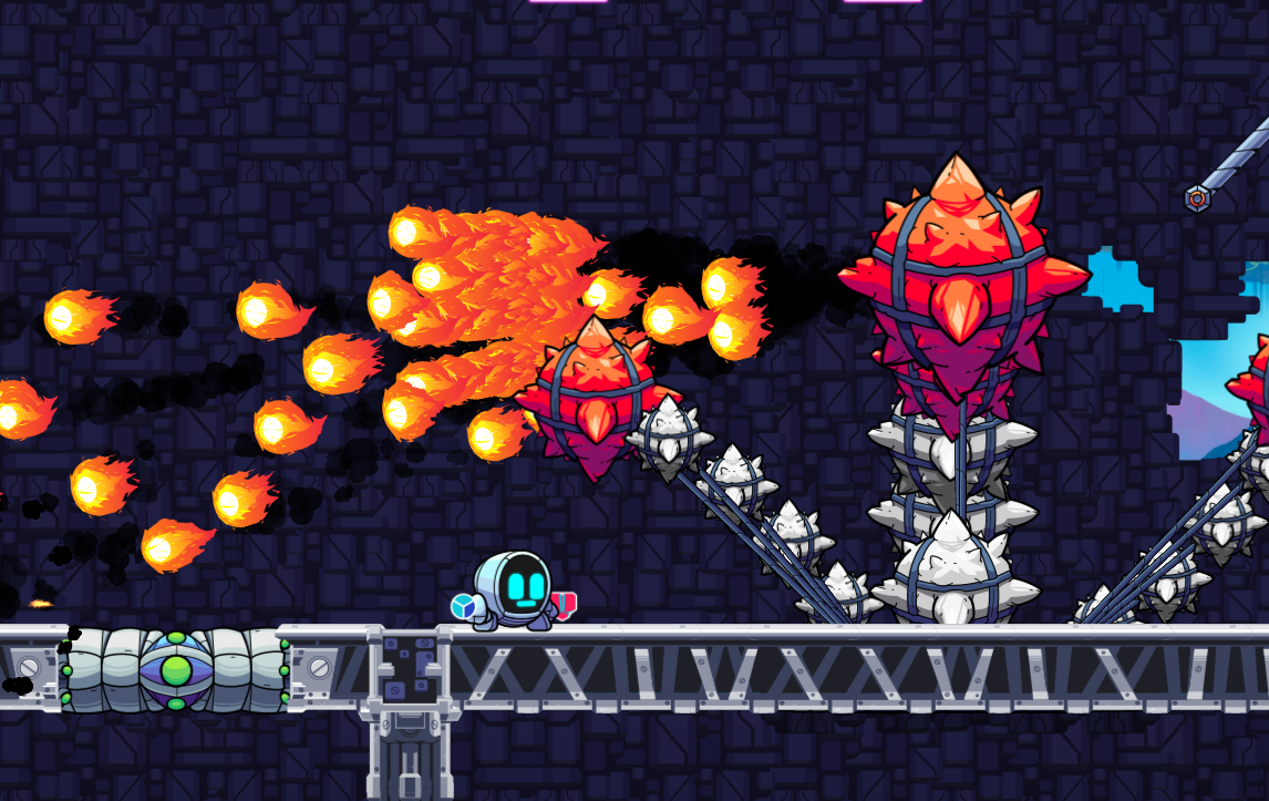 GR-18 must make its way up a tower riddled with fire and enemies in Tengu's level Cloud Tower Ascent. This tower's spike-covered guards might seem like just that, but won't GR-18 be astonished when it finds out they also shoot fire!
