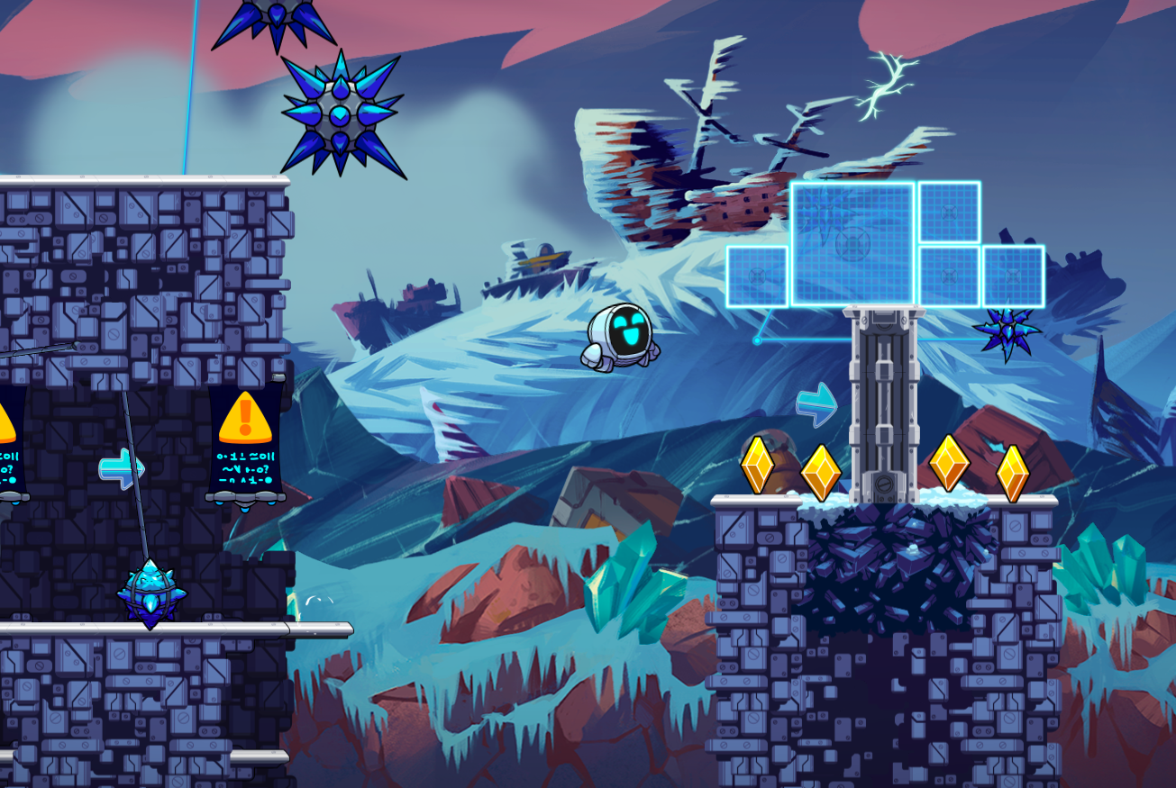 GR-18 has managed to foolishly misplace the package on the way to the delivery site, and must now traverse a snowy cityscape to retrieve it in Blue Toad's level Krokrete Winter.