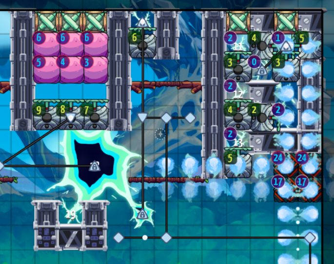 Crates on conveyor belts hit pressure plates to manage the battle options.