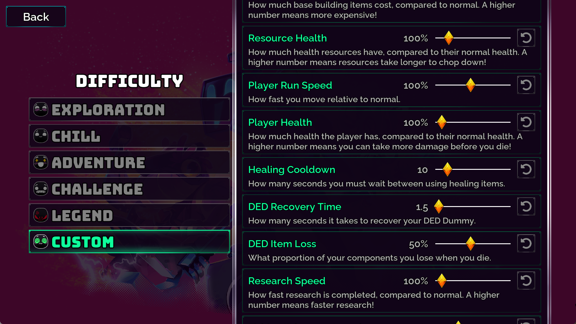 Grab the sliders and play around with a whole bunch of variables to change how the game feels and plays! Make stuff turbo fast, turbo slow, way too hard, way too easy — it’s up to you! When playing in Custom Difficulty, you can even change the sliders during gameplay, and the game will dynamically adjust on the fly.