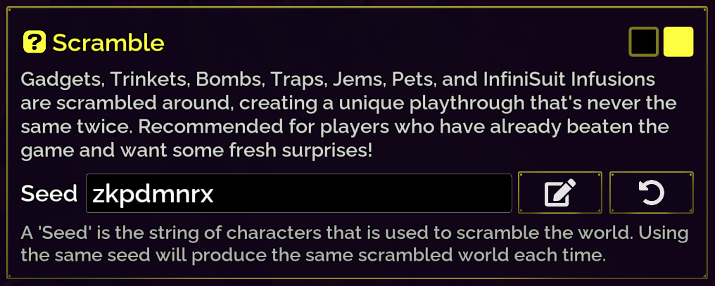Last, to make sure you can share a Scrambled world with the community if you have a particularly fun run, we added a seeding system. The same seed will always scramble the world in the same way.
