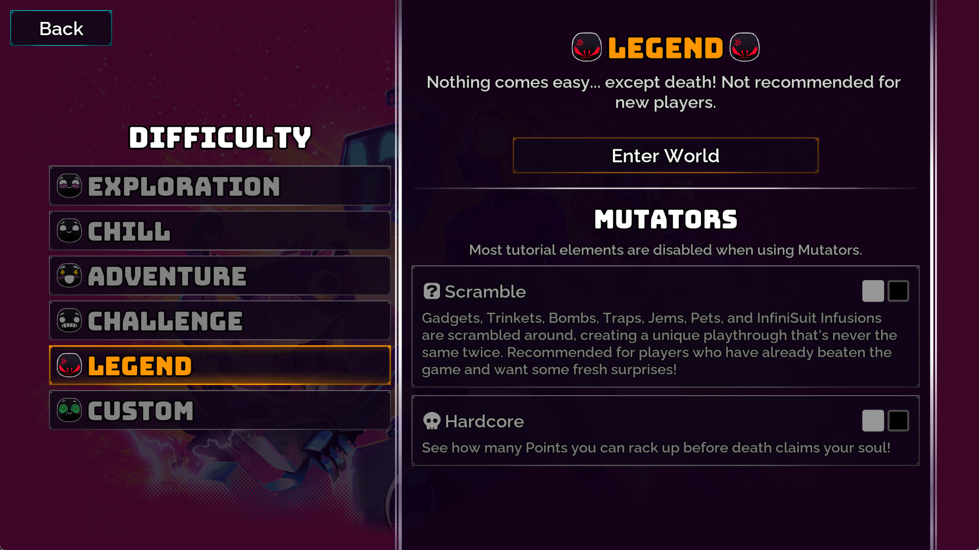One of our main goals for Update 1.2 was to add lots of replay value to Crashlands 2 by coming up with ways for your second, third, and ninetieth playthroughs to stay fresh and interesting. So we added two new MUTATORS: Scramble and Hardcore! These mutators are meant for more experienced players, so most tutorial quests and UI elements are disabled when playing with any mutators active.