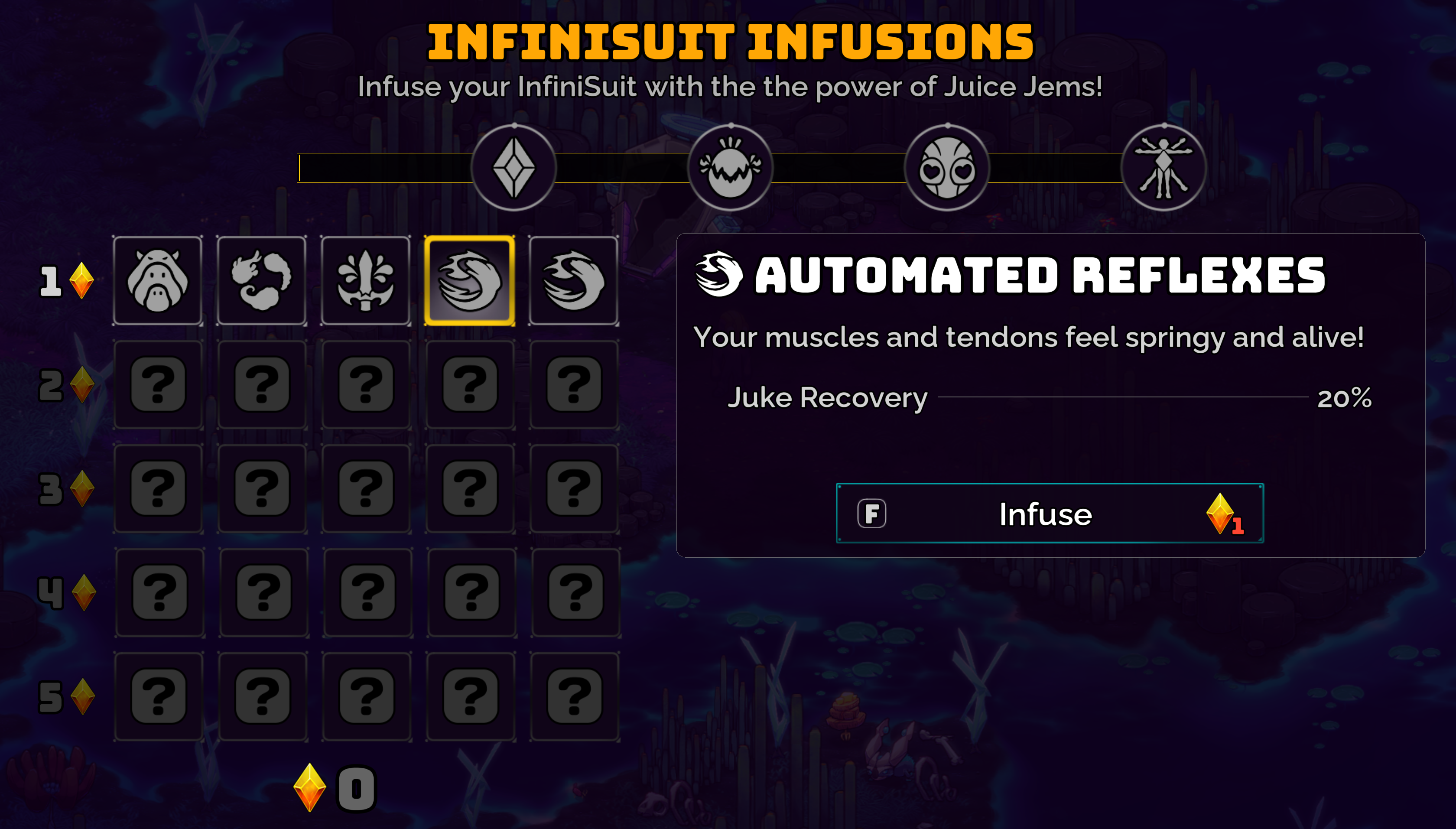 In Scramble, the Infusions for your InfiniSuit are mixed around to new locations in the tree. Sometimes you’ll get a bunch of cheap Juke Recovery in the first row, or maybe a bunch of extra crit right off the bat! In Scramble, you’ll have to adjust your Jem spending strategy on the fly as you uncover your Infusions.