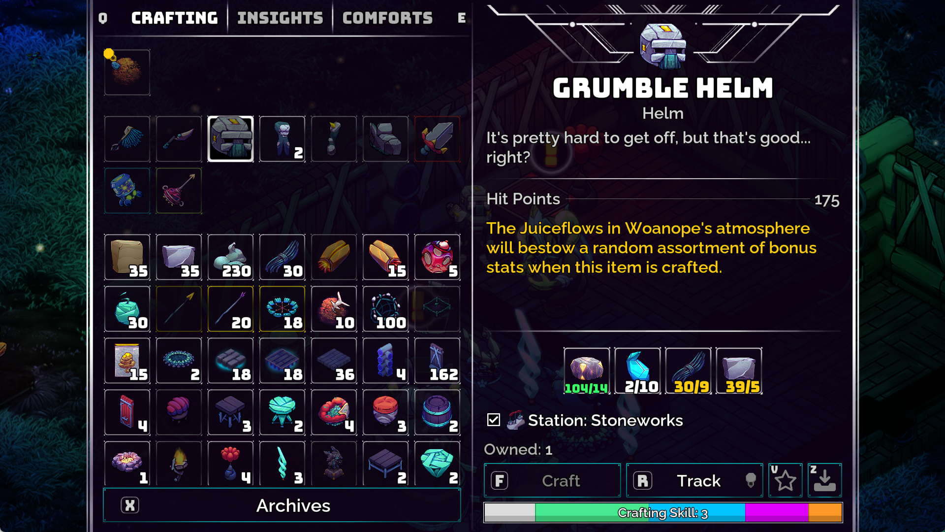 With this system, your crafting page takes into account the whole stack of components necessary to make something and crafts them automatically, so you no longer have to manually create the individual components before making a downstream item. For example, if you wanted to make some Grumblestone Tiles, previously you’d have to first craft a bunch of Grumble Slabs manually, and then go craft your Grumblestone Tiles. Now, you can just directly craft the Grumblestone Tiles, and the necessary Slabs will be crafted automatically.
