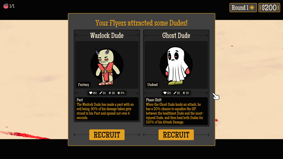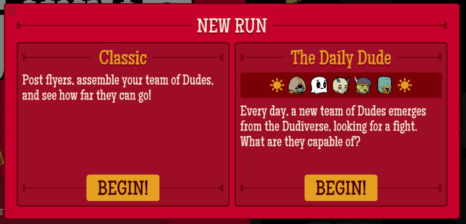 When starting a new run, you will now have the option to play a “Classic” run or “The Daily Dude”. The Daily Dude is a randomized team of Dudes that you can play for that day, and everyone in the world will have the same Daily Dude selection on the same day. See how far you can get with whatever weird team comp RNGesus comes up with!