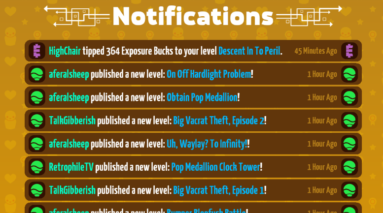 Levelhead now has a new NOTIFICATIONS page, so you can see who did what and when! Did someone tip Exposure Bucks to your level? Did someone subscribe to you? Did someone STEAL YOUR PRECIOUS CROWNS? Now you know!
