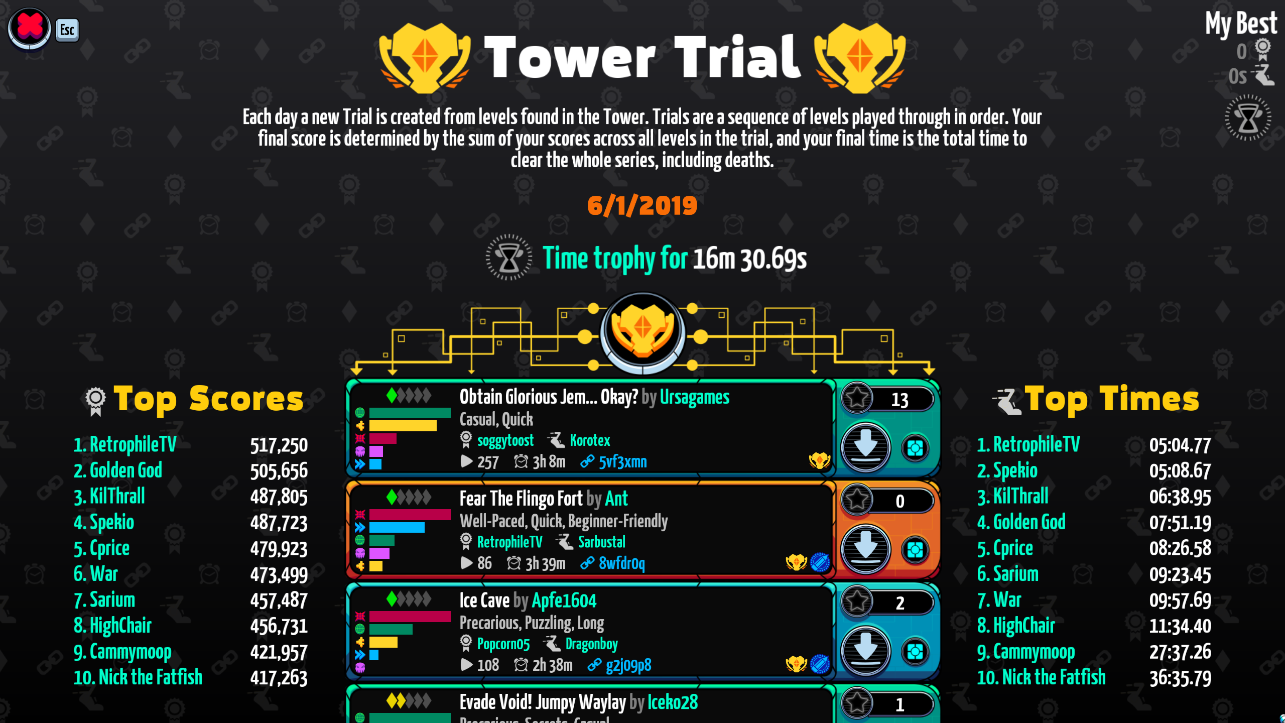 - A new daily competition section has opened up in the Tower! It's called the "Tower Trial." Every day, six levels are pulled from the tower and turned into a playlist. Competitors in the Tower Trial compete for score and time across all six levels back to back. In this mode, the timer continues running across deaths (except when restarting the very first level of the Trial), and your total time is the amount of time it took you to clear the entire trial. The Tower Trial also has a "Time Trophy" available for anyone who clears the entire trial in less than the displayed time. This feature is still a work in progress, so please give us feedback!