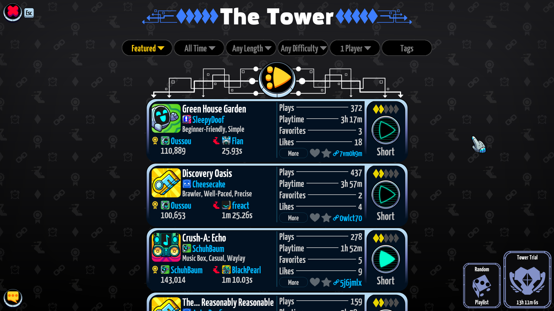 Now, when you click the Random Playlist button, you'll get a random playlist that matches whatever your filters are in the Tower. Want a playlist of just "Short" levels tagged as "beginner-friendly"? Or perhaps a playlist of "Troll" levels? Now you've got it!