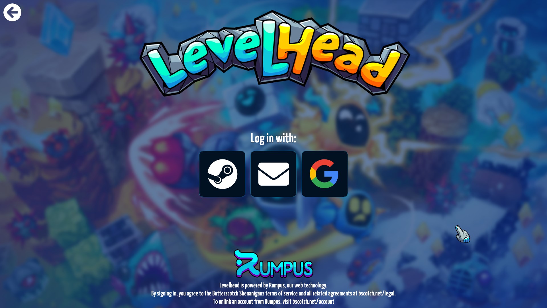 - Fully updated the visuals of the Login pages to be Levelhead themed instead of Rumpus themed, with Rumpus information along the bottom as a side note.